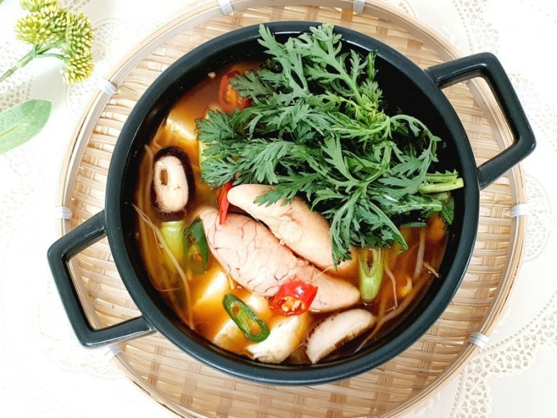 Apaga el fuego y coloca artísticamente las rodajas de Chrysanthemum coronarium o hojas de Perilla picadas en la parte superior como adorno. El calor suave liberará su aroma, realzando aún más el sabor del Al Tang.
