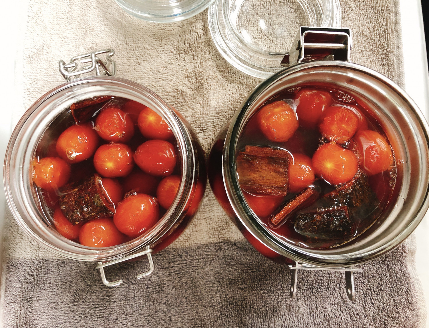 Antes de verter el líquido, divida los trozos de canela entre los dos frascos y colóquelos entre los tomates. El cálido color de la canela complementa maravillosamente los tomates rojos.