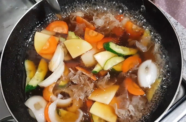 Haz la salsa Tangsu. En una olla, combina 360 ml de agua, 8 cucharadas de azúcar, 4 cucharadas de vinagre y 3 cucharadas de salsa de soja. Lleva a ebullición a fuego medio. Una vez que hierva, incorpora el espesante preparado (2.5 cucharadas de maicena + 2.5 cucharadas de agua) y cocina, removiendo, hasta que la salsa espese a tu gusto. Añade las verduras preparadas (pepino, zanahoria, cebolla, oreja de madera) y la manzana a la salsa hirviendo y cocina brevemente solo para ablandarlas antes de apagar el fuego. Cocinar demasiado hará que las verduras pierdan su crocancia. *Consejo: La consistencia del espesante puede parecer diferente cuando la salsa está caliente o fría. Es mejor dejar que la salsa se enfríe un poco antes de añadir el espesante para medir el grosor, o ten cuidado de no hacer la salsa demasiado espesa. Si la salsa terminada queda muy densa, puedes añadir un poco de agua para ajustar la consistencia.