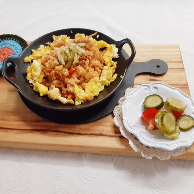 Ahora, es hora de añadir los condimentos que realzarán el sabor de tu tazón de arroz. Agrega 1 cucharada de salsa de ostras y 1 cucharada de salsa de soja. Para un aroma a nuez, añade una pizca de semillas de sésamo y, para un toque refrescante, agrega pepinillos encurtidos finamente picados. (Si no tienes pepinillos encurtidos, los rábanos encurtidos dulces finamente picados, o ‘danmuji’, también funcionan bien). Mezcla todo suavemente con una espátula, con cuidado de no aplastar los granos de arroz. Saltear a fuego bajo resultará en arroz suelto y sabores bien combinados.