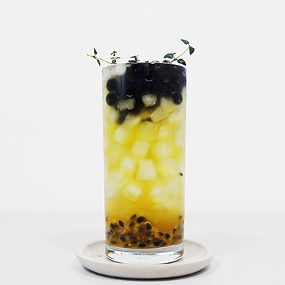 Finalmente, añade una porción generosa de las perlas de tapioca negra previamente cocidas y masticables a la bebida. Si lo deseas, decora con unas hojas de menta fresca para un toque extra de frescura y atractivo visual. ¡Tu delicioso té de burbujas de maracuyá casero está ahora listo para ser disfrutado!