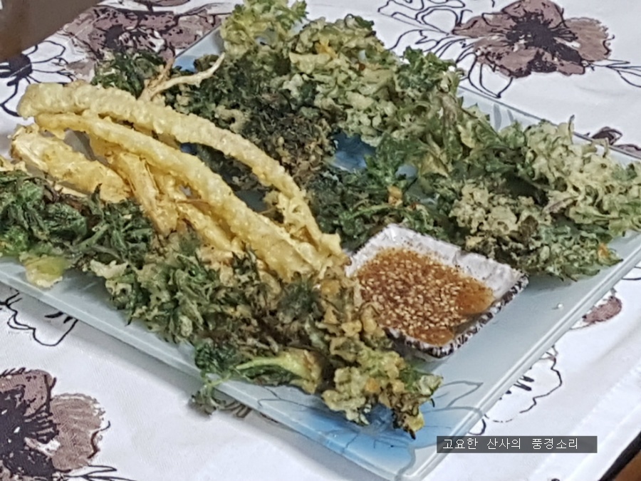 Este plato se prepara con el máximo cuidado para mi marido, quien trabaja incansablemente como candidato a la asamblea provincial. Se levanta temprano, termina el desayuno y se despide al salir al trabajo, interactuando activamente con los constituyentes para darse a conocer. Hace unos días, regresó a casa tarde y dijo: ‘¡Tengo hambre! ¡Hoy me apetece algo grasoso y frito!’. Aunque esa noche le preparé rápidamente algunos acompañamientos, al día siguiente decidí hacer tempura utilizando artemisa fresca, hierba de San Juan y raíz de flor de campanilla que había cosechado personalmente de nuestro jardín. Esta tempura, rebosante de la esencia de la primavera, ayudará a aliviar su fatiga y servirá como una comida satisfactoria. ¡Muestra a tu marido tu cálido afecto con esta tempura hecha con amor!