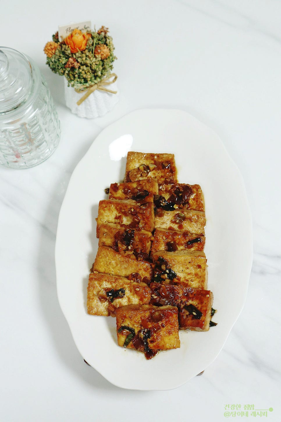 En la misma sartén utilizada para freír el tofu, agregue las cebolletas verdes cortadas y saltee brevemente hasta que estén fragantes. Una vez liberado el aroma de las cebolletas, vuelva a colocar los trozos de tofu frito en la sartén de manera organizada. Vierta todo el glaseado de soja preparado uniformemente sobre el tofu.