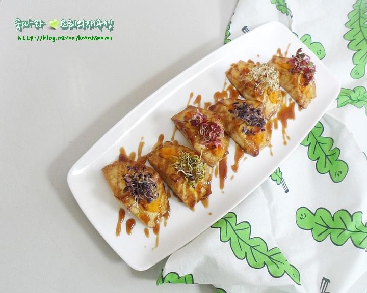 Usando una cucharadita, llene generosamente el corte en el centro de cada triángulo de tofu con la calabaza dulce machacada. La dulzura de la calabaza complementará maravillosamente el tofu salado.