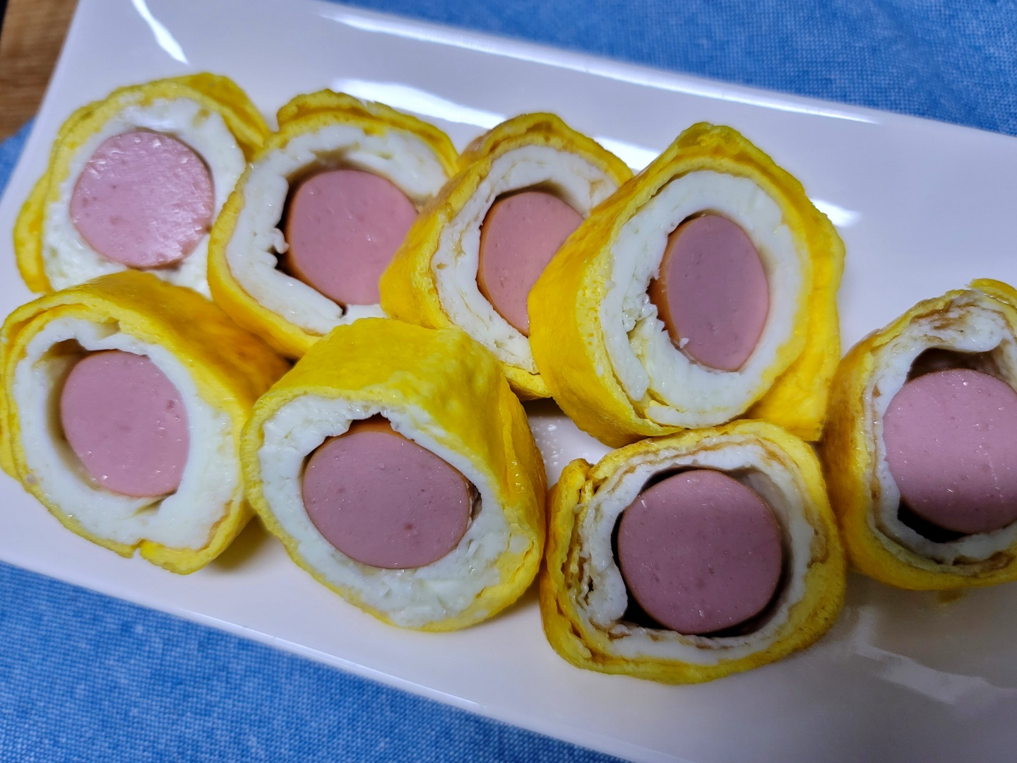Sirva su deliciosa tortilla enrollada con salchicha sobre arroz caliente. ¡Sumerja en su kétchup favorito para una experiencia de sabor inolvidable! La combinación de salchicha sabrosa y huevo tierno le sacará una sonrisa. ¡Disfrute de esta delicia que roba el arroz! ^^