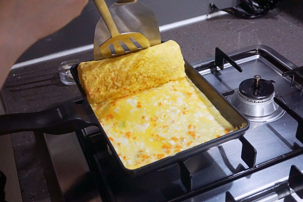 Una vez que la capa inferior del huevo esté ligeramente cuajada y los bordes comiencen a verse cocidos (pero no completamente firmes), comienza a enrollarla con cuidado. Mantén el fuego bajo para asegurar que se cocine suavemente.