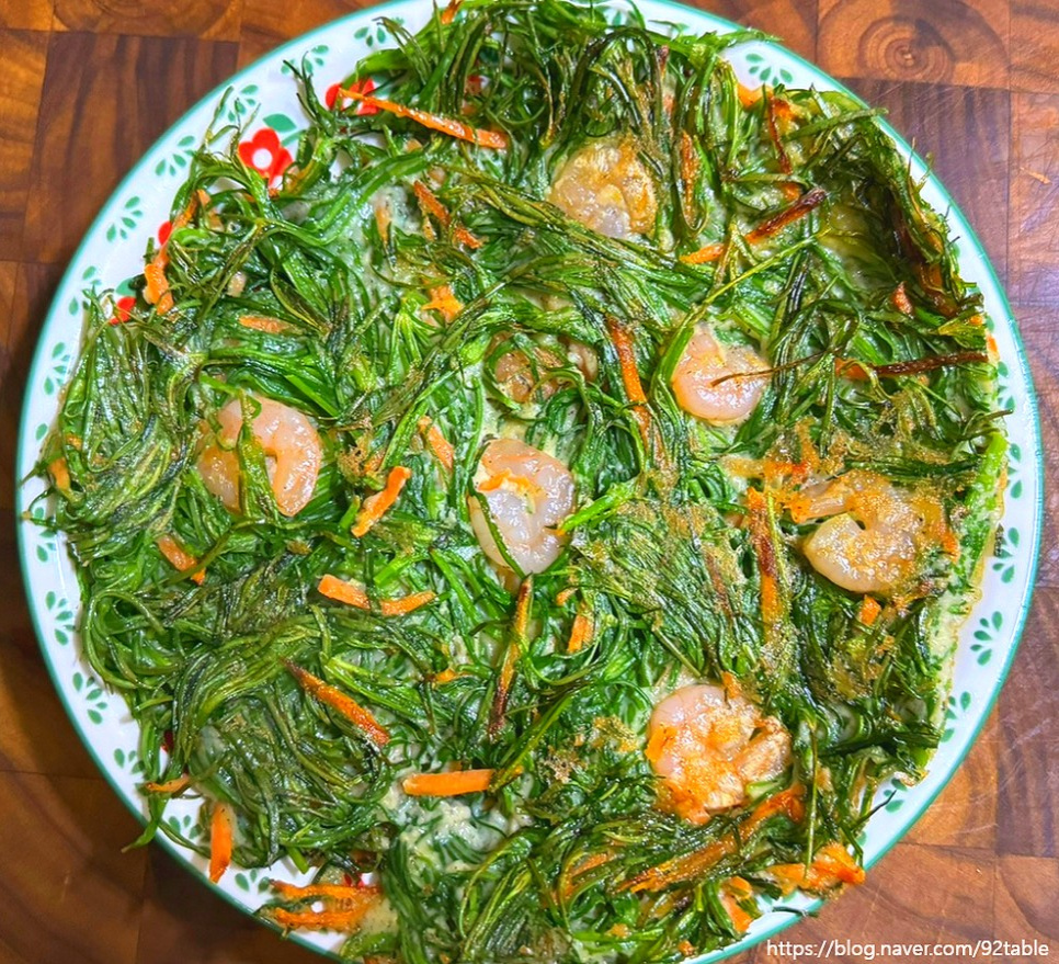 ¡Tu deliciosa tortita de espinaca marina está lista cuando ambos lados estén dorados! Cuanto más fina hagas la tortita, más apreciarás el sabor único, fresco y aromático de la espinaca marina. ¡Disfrútala caliente con una salsa de soja para mojar!