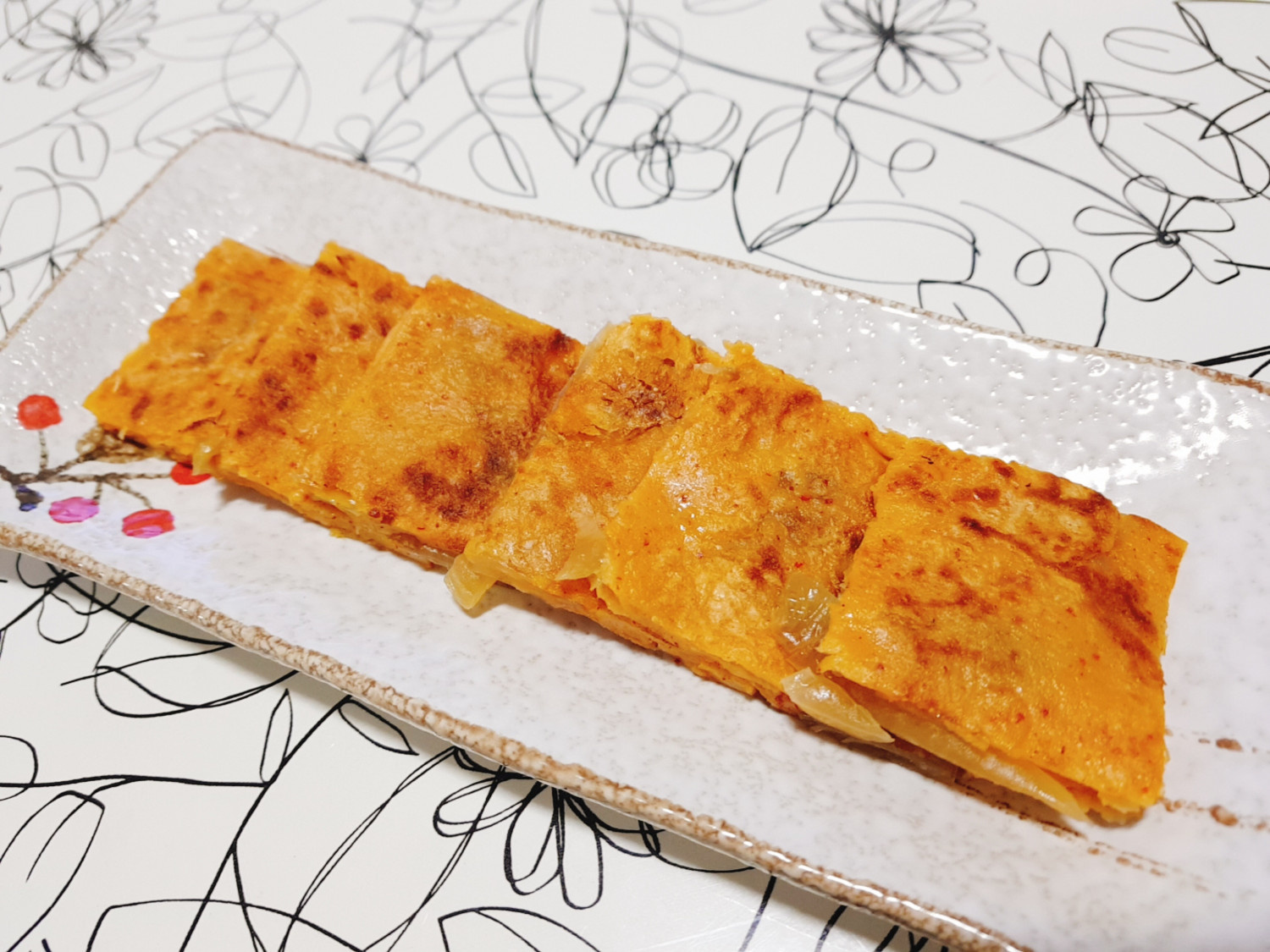 Sirve la tortita de kimchi dorada en un plato. Se disfruta mejor inmediatamente mientras está caliente. También puedes acompañarla con una salsa de soja si lo deseas.