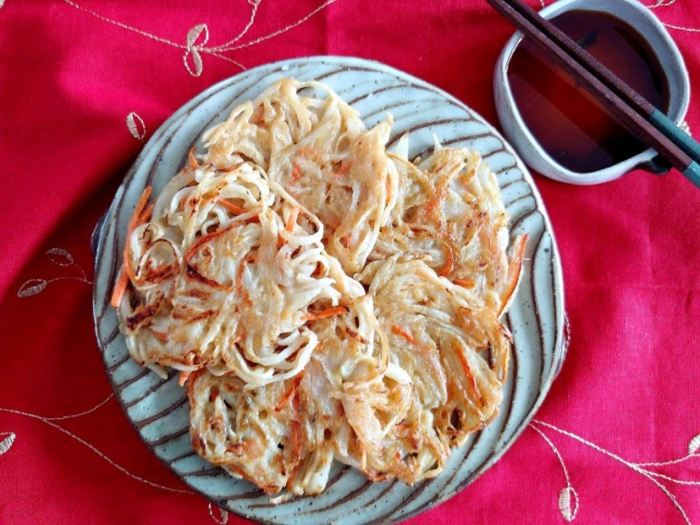 En lugar de las típicas tortitas finas y redondas de rábano, he preparado estas con rábano rallado para obtener una deliciosa textura crujiente. Es como si estuviera haciendo ensalada de rábano y decidiera freír una parte. Son aún más sabrosas cuando se sirven con una cucharada de ensalada de rábano agridulce encima.