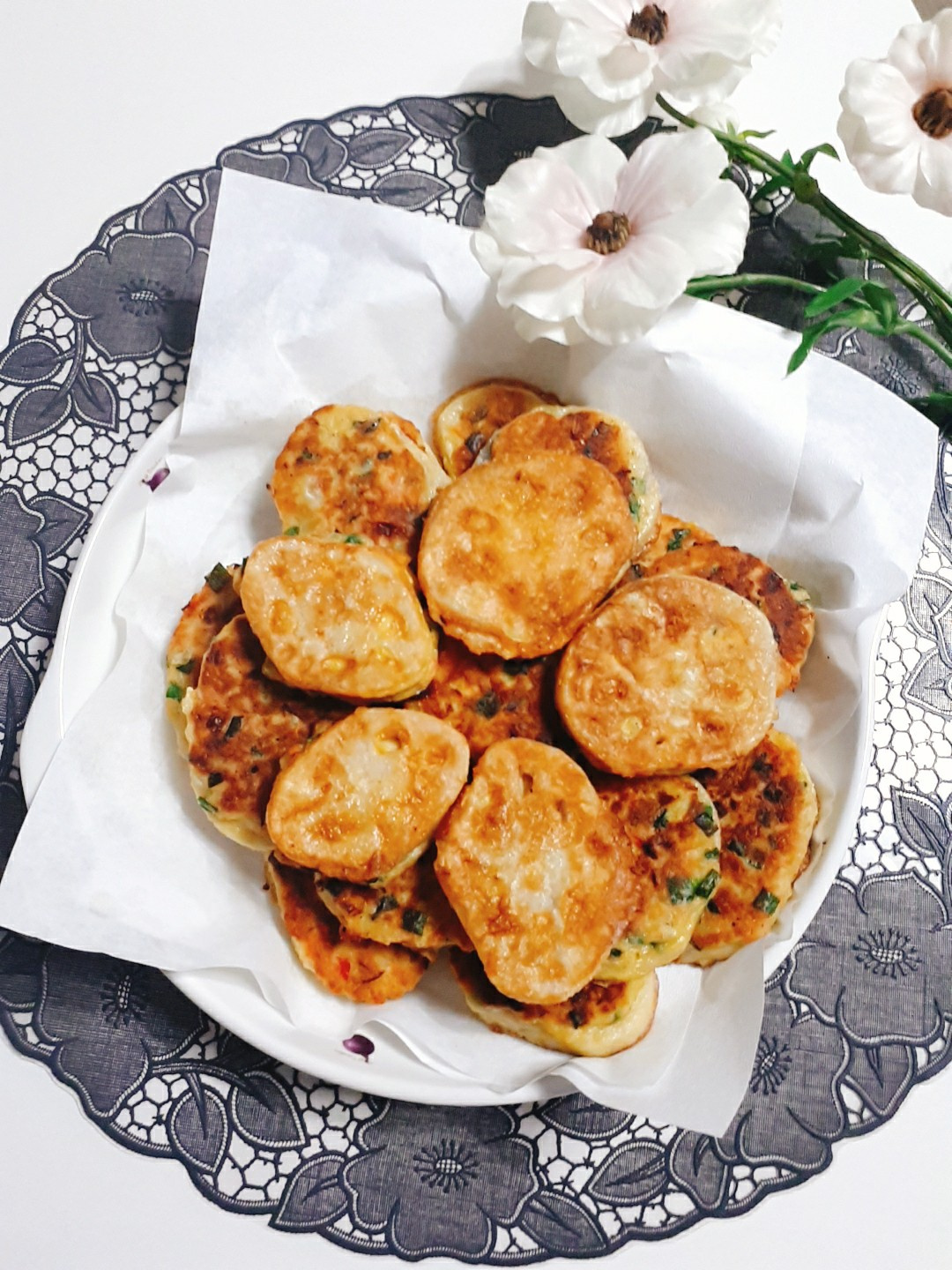 Deliciosas tortitas de raíz de loto de temporada de otoño. ¡Fáciles de preparar con masa sobrante de albóndigas!