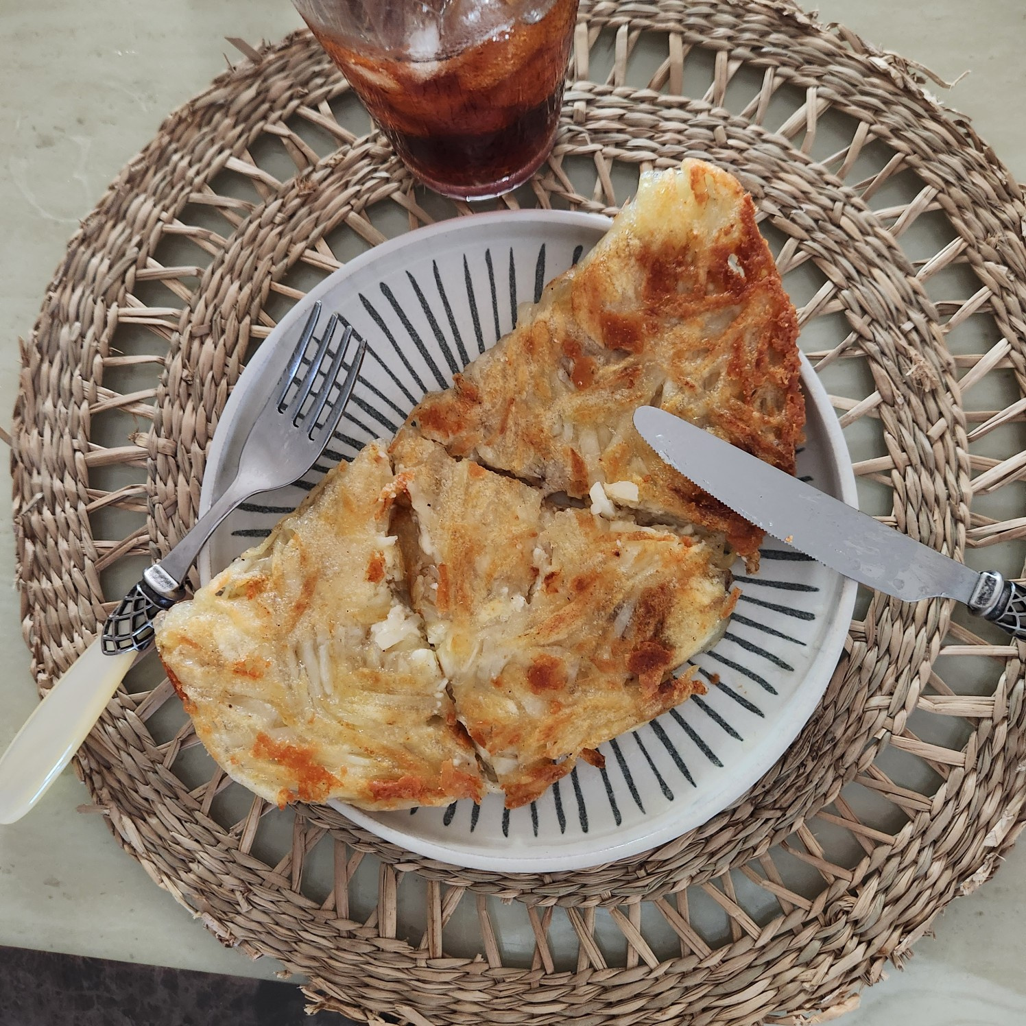 Calienta una sartén antiadherente a fuego medio con una cantidad generosa de aceite de cocina. Extiende la mezcla de papa finamente en la sartén. Cocina hasta que la parte inferior esté dorada y crujiente, luego voltea con cuidado y cocina el otro lado hasta que esté igualmente dorado y crujiente. Extenderla finamente es clave para asegurar que se cocine de manera uniforme.