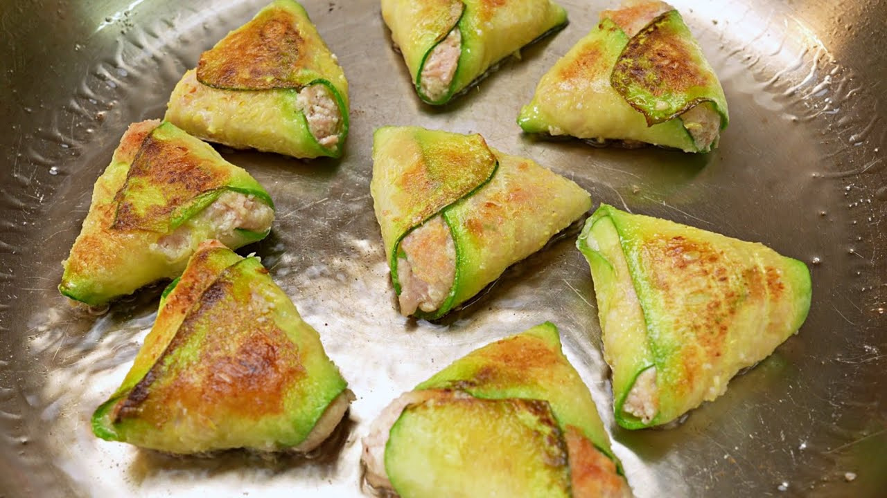 Cubre el relleno con otra rodaja de calabacín, doblándola por la mitad para crear una forma de triángulo. Presiona suavemente los bordes para sellar el relleno en su interior, asegurándote de que no se escape durante la cocción. Es similar a doblar una empanadilla triangular. Esta forma hace que las tortitas sean visualmente atractivas y añade un toque de estilo fusión.