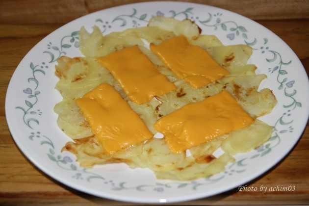 Coloca las lonchas de queso sobre la tortita de patata al gusto. Espera hasta que el queso se derrita por completo y luego apaga el fuego. ¡Tu deliciosa tortita de patata con queso estará completa! Sírvela inmediatamente mientras esté caliente para disfrutar del mejor queso fundido.