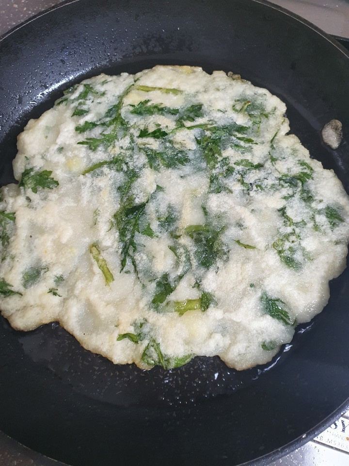 Calienta una sartén a fuego medio y añade una cantidad generosa de aceite de cocina. Vierte aproximadamente media taza de la masa en el aceite caliente y extiéndela finamente y de forma amplia para darle forma de tortita. Puedes hacerla redonda o de la forma que prefieras. Una vez que los bordes comiencen a dorarse, reduce el fuego a medio-bajo, tapa la sartén con una tapa y cocina hasta que el centro esté hecho. Tapar la sartén ayuda a retener la humedad, asegurando un interior tierno.