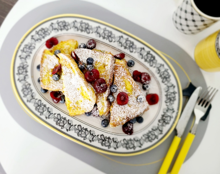 Transfiere cuidadosamente la Tostada Francesa de Batata con Queso cocida a un plato. Para un toque decorativo, espolvorea azúcar glas usando un colador y decora con frutas frescas como cerezas y arándanos. ¡Disfruta de este contundente desayuno con café o leche!