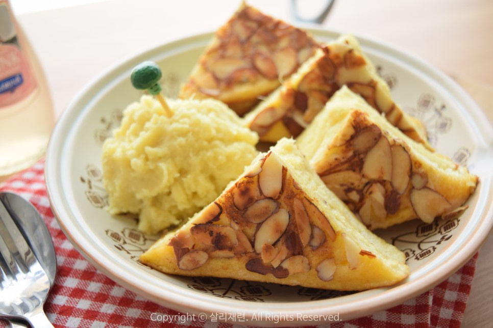 Cubrir la tostada francesa con almendras fileteadas antes de cocinarla no solo la hace lucir hermosa, sino que también añade un maravilloso contraste de textura y un aroma a nuez, haciéndola atractiva visualmente y nutricionalmente mejorada.