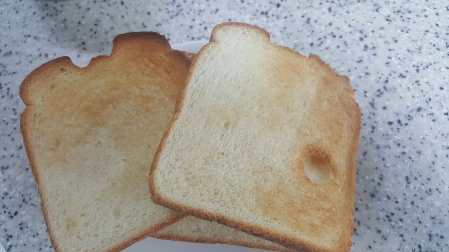 Ahora, da la vuelta a cada rebanada de pan. Notarás que la parte inferior todavía está pálida y sin tostar, mientras que la parte superior ha comenzado a dorarse. Es hora de tostar este lado.
