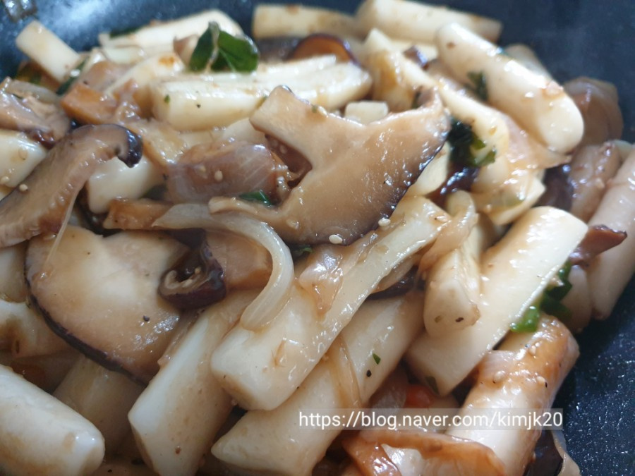 A medida que los pasteles de arroz comiencen a ablandarse ligeramente, crea espacio en la sartén o vierte en los huecos: añade 4 cucharadas de salsa de soja, 2 cucharadas de agua, 1 cucharada de miel (o sirope de maíz), los champiñones shiitake en láminas y 1.5 cucharadas de ajo picado. Deja que esto hierva a fuego medio-bajo durante unos 5 minutos, permitiendo que los sabores se mezclen y que los pasteles de arroz absorban la salsa. Los champiñones absorberán la salsa, realzando el sabor general.