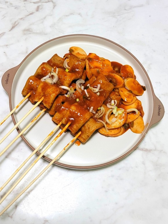 ¡Tu delicioso Tteokbokki Rojo Picante de Pastel de Pescado está listo! Servirlos en brochetas los hace extra divertidos de comer. (Si deseas una porción más grande, puedes cortar los pasteles de pescado en lugar de ensartarlos. Sin embargo, si omites las brochetas, usa menos agua inicialmente y cocina a fuego alto para evitar que los pasteles de pescado se ablanden demasiado). ¡Reaviva tu apetito con este sabroso y picante plato!