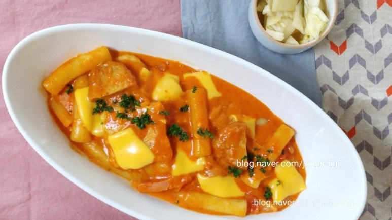 Sirve el Tteokbokki Rosado recién cocido en un plato bonito. Si lo deseas, cúbrelo generosamente con queso mozzarella. El queso se derretirá en la salsa, añadiendo una textura maravillosamente rica.