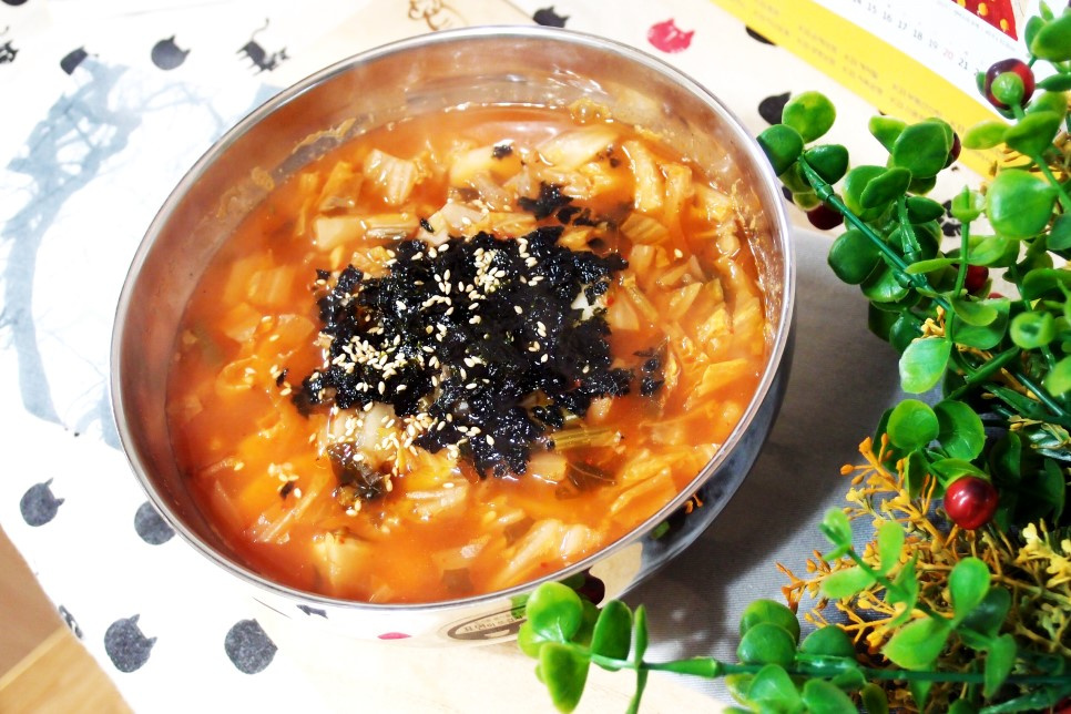 Un tteokguk claro y refrescante con caldo de anchoas es delicioso, y un tteokguk rico y profundo con caldo de huesos o de ternera es magnífico. Sin embargo, ¡la estrella de hoy es el caldo de ‘Kimchi Jjigae’! Estamos preparando ‘Tteokguk de Kimchi’ añadiendo pasteles de arroz masticables a un sabroso caldo de kimchi, cocido a fuego lento con kimchi bien fermentado en una base de caldo natural comprado o caldo casero de anchoas y algas. Este plato es un favorito perenne que nunca pasa de moda. Cubriéndolo generosamente con sabrosas algas tostadas desmenuzadas (gim) se realza su sabor, creando un tazón irresistible que te dan ganas de añadirle arroz y terminar hasta la última gota. Perfecto para disfrutar de una comida caliente en un día frío, ¡hagamos Tteokguk de Kimchi ahora mismo!