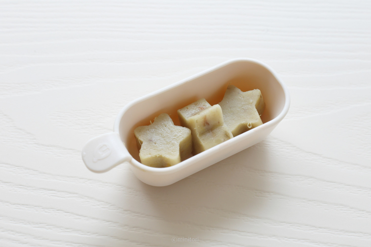 Primero, prepara tus cubos de batata y castaña. Si están congelados, mételos en el microondas durante aproximadamente 1 a 1 minuto y 30 segundos para descongelar. Una vez descongelados, machácalos suavemente y mézclalos. (Si usas puré, puedes usarlo directamente.)