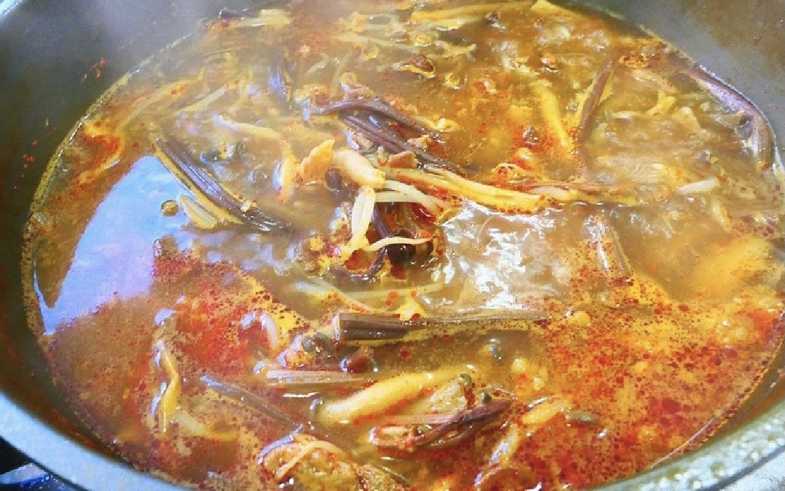 Transfiera la mezcla sazonada al caldo de carne preparado. Si el caldo se ha reducido durante la cocción a fuego lento, añada un poco de agua para alcanzar la consistencia de sopa deseada. Lleve a ebullición a fuego alto, luego reduzca a medio-bajo y deje cocer a fuego lento hasta que todos los ingredientes estén tiernos y los sabores se mezclen. Pruebe y ajuste el condimento con sal según sea necesario. Permita que hierva a fuego lento para desarrollar completamente el sabor picante.