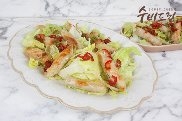 En un plato de servir, coloca la lechuga romana y la cebolla cortadas en juliana que preparaste anteriormente. Coloca encima el Yurinko de pechuga de pollo crujiente y cocinado en freidora de aire. Rocía generosamente la salsa Yurinko agridulce y refrescante preparada por encima. ¡Disfruta de tu delicioso Yurinko de pechuga de pollo inmediatamente para obtener la mejor textura y sabor!