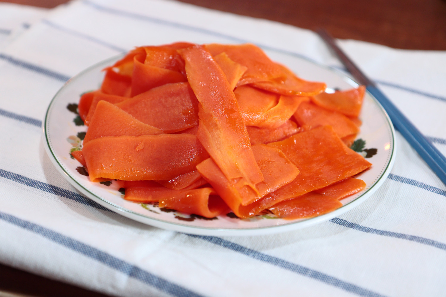 Coloca todas las láminas finas de zanahoria en una olla. Extiéndelas sin que se superpongan para que se cocinen de manera uniforme. Ahora, preparemos los ingredientes de la salsa que realzarán la dulzura natural de la zanahoria.