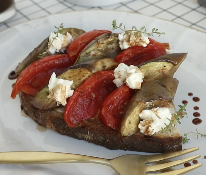 Iris terong secara diagonal dengan ketebalan sekitar 0,5 cm, usahakan bentuknya mirip dengan irisan tomat. Ini akan membuat tampilan tartine lebih menarik nantinya.