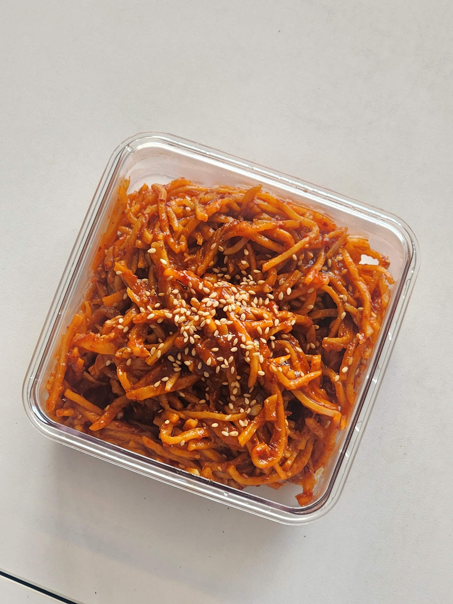 Setelah dikeluarkan dari microwave dan sedikit mendingin, potong kembali Jinmichae menjadi potongan yang lebih mudah diatur dan berukuran sekali suap. Jika masih terlalu panjang, potong lebih pendek, terutama jika akan dimakan oleh anak-anak.