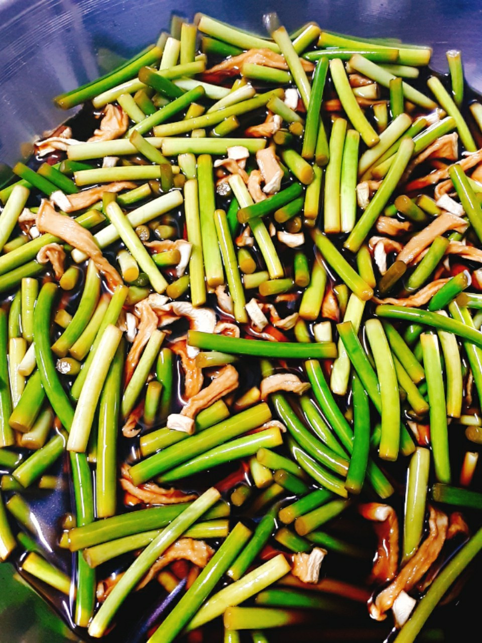 Saya membuat acar berbahan dasar kecap asin dengan menambahkan lobak kering ke batang bawang putih musiman.