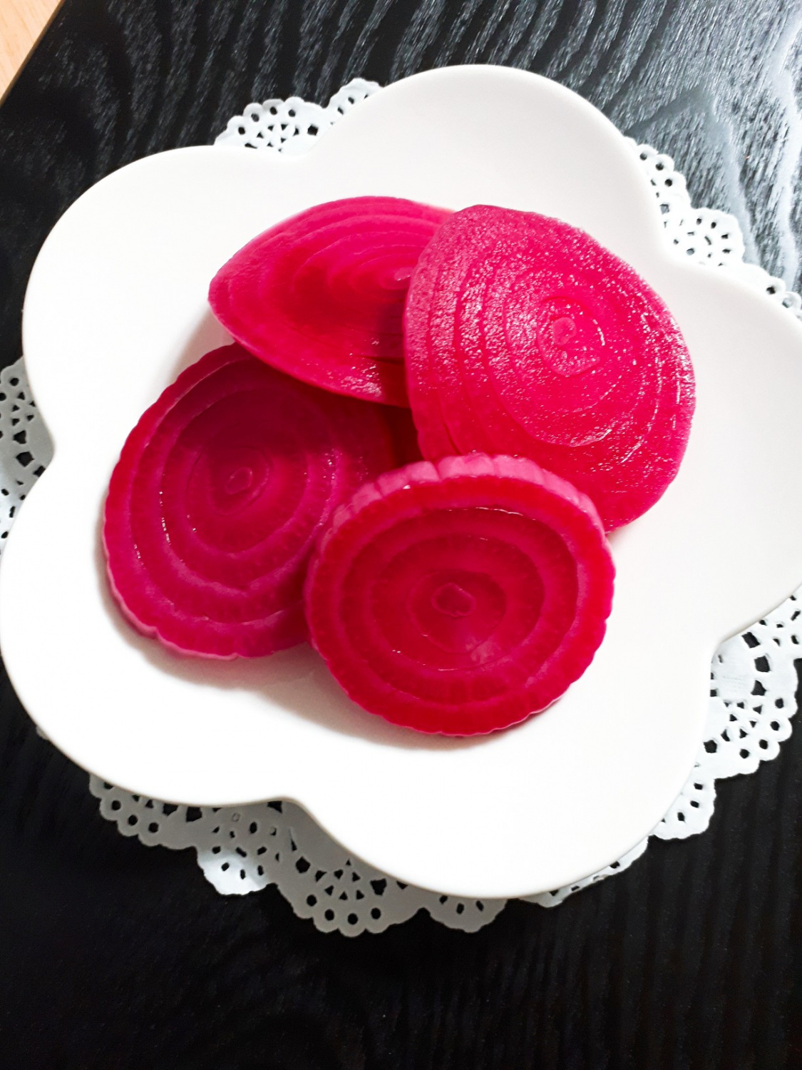 Kupas dan cuci ubi bit, lalu keringkan. Iris ubi bit setipis mungkin menjadi porsi 80g. Menggunakan terlalu banyak ubi bit dapat menghasilkan warna yang terlalu gelap yang mungkin menutupi warna alami bawang merah. Ubi bit yang diiris tipis akan melepaskan warna indahnya secara lebih merata.