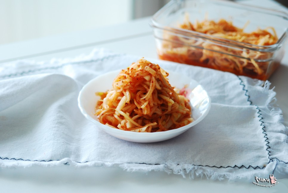 Sedikit menggarami lobak yang sudah diiris julienne membuatnya semakin renyah dan membantu menyerap bumbu dengan lebih baik. Meskipun bisa langsung dicampur, sedikit rendaman garam dan gula akan meningkatkan rasanya. Campurkan 1 sdm garam kasar dan 1 sdm gula dengan lobak, aduk rata hingga terlapisi.