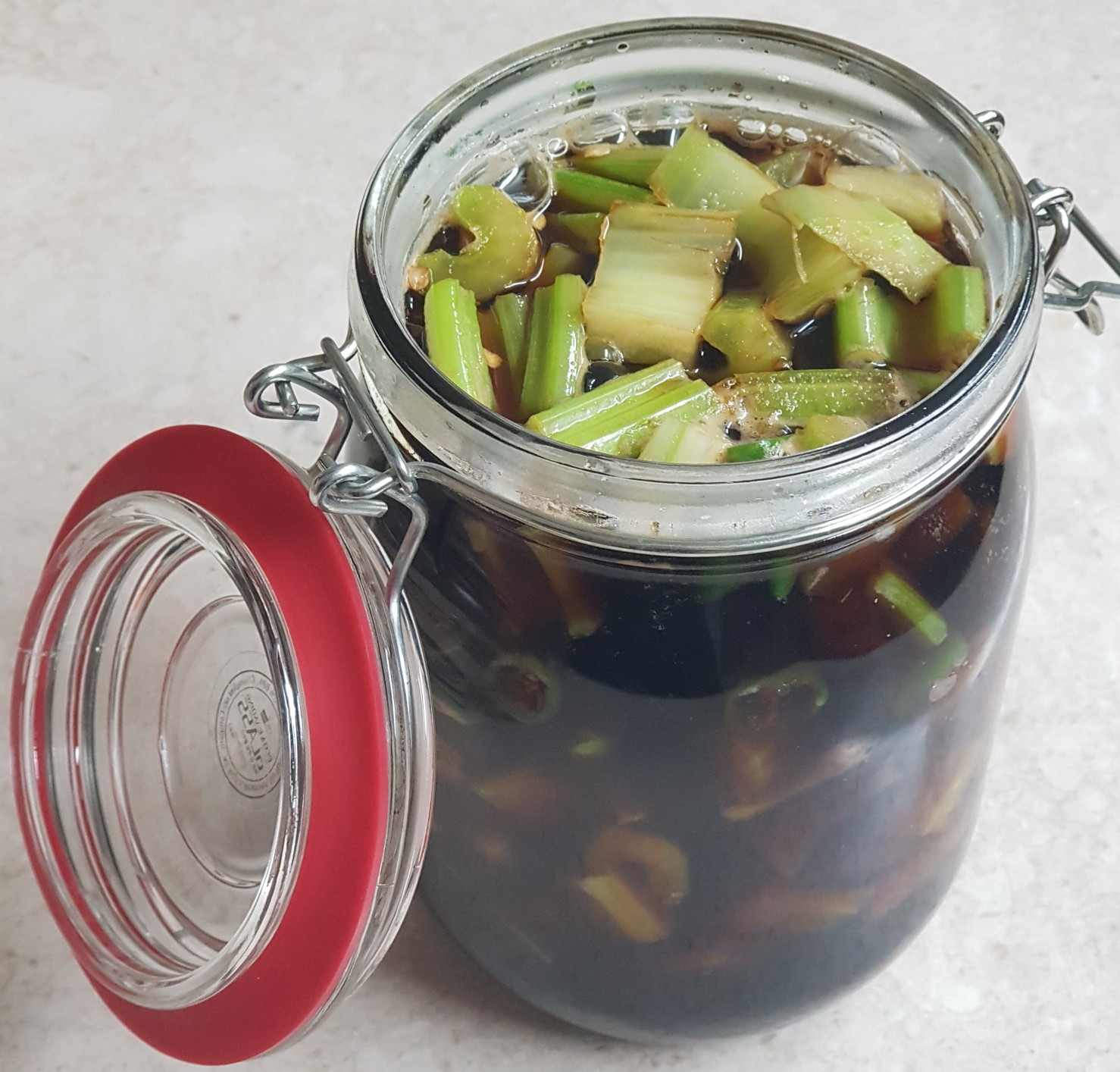 Tuangkan air rendaman panas yang baru direbus ke atas seledri dan cabai di dalam wadah. Menuangkannya saat masih panas membantu seledri tetap renyah dan memungkinkan air rendaman meresap ke dalam bahan-bahan secara efektif. Pastikan bahan-bahan terendam sepenuhnya dalam cairan. Kemudian, segera tutup rapat wadah untuk menyegelnya. Sangat penting untuk mencegah uap keluar.