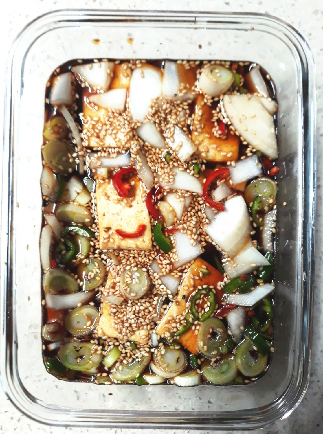Susun tahu yang sudah dingin dengan rapi di wadah penyimpanan Anda. Lapisi secara merata dengan bawang bombay, daun bawang, cabai rawit merah, dan cabai merah besar yang sudah disiapkan di atas tahu. Menambahkan banyak sayuran akan meningkatkan aroma dan tekstur, membuatnya jauh lebih lezat.