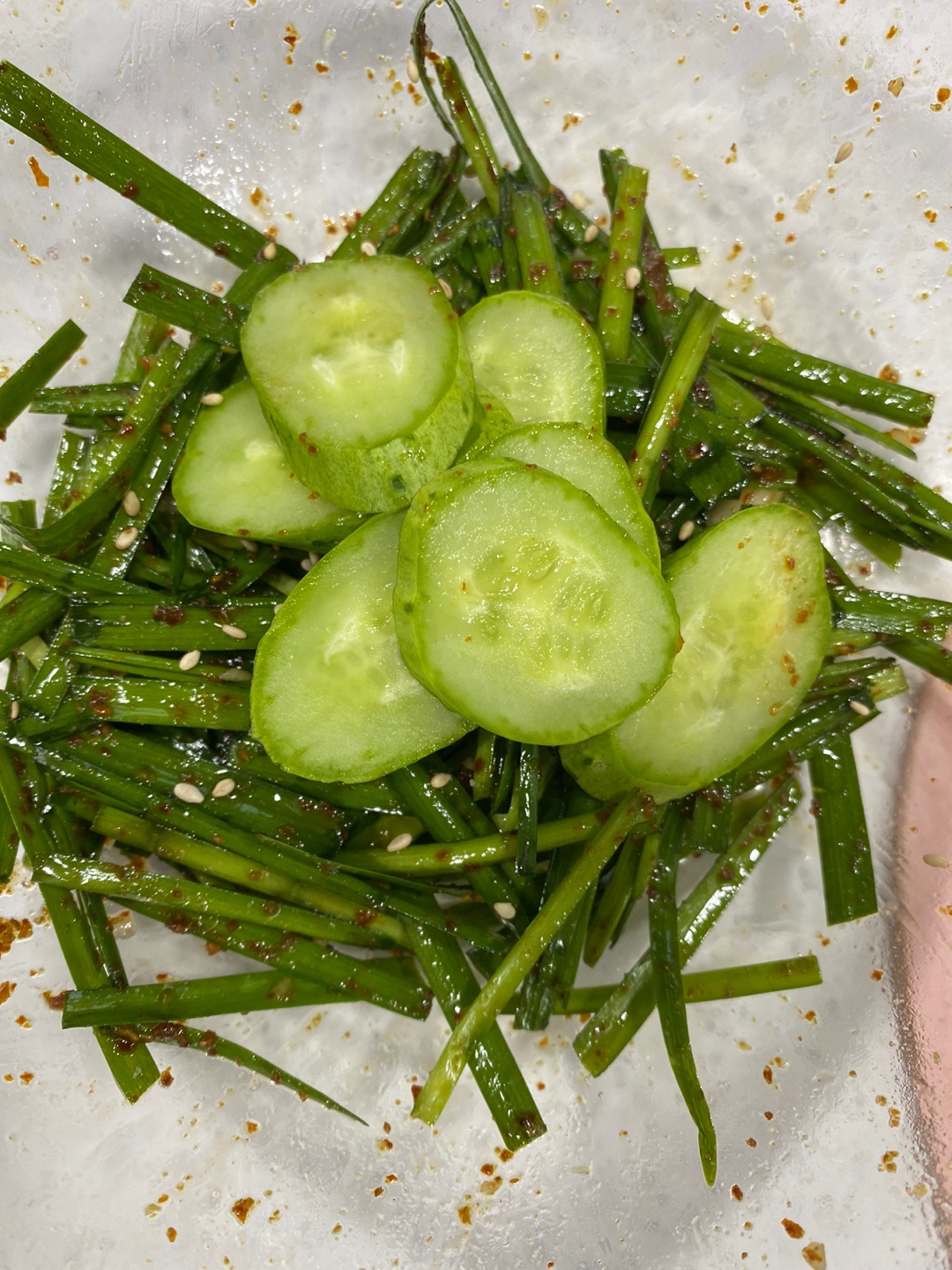 Kombinasi daun kucai dan timun yang fantastis! Saya membuat acar ini untuk disajikan bersama kongguksu (mi dingin kuah kacang kedelai). Ini adalah hidangan pendamping yang menyegarkan, sedikit asam, dan sangat mudah dibuat.