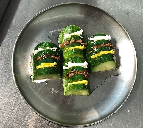 Isi irisan timun yang sudah disiapkan dengan hati-hati menggunakan irisan telur kuning, diikuti oleh tumisan jamur shiitake dan daging sapi, lalu terakhir irisan telur putih. Hindari mengisi terlalu penuh agar bentuknya tidak berantakan.