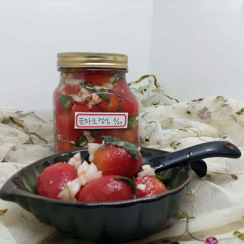 Pindahkan tomat yang sudah dimarinasi ke dalam stoples kaca bersih untuk disimpan. Meskipun lezat untuk dimakan segera, mendinginkannya di lemari es akan meningkatkan rasa segarnya.