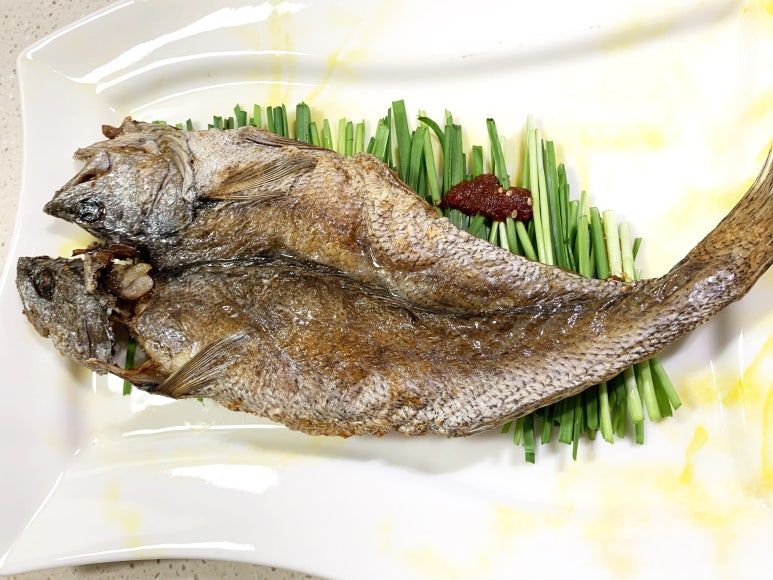 Setelah ikan croaker semi-kering matang sempurna setelah dipanggang selama 40 menit (total waktu ini disebabkan oleh kesalahan awal dengan plastik, yang saya mohon maaf sebesar-besarnya – penglihatan saya sudah tidak sebaik dulu!), letakkan dengan hati-hati ikan panggang yang indah di atas daun kucai yang sudah dibumbui. Hasilnya adalah hidangan yang menakjubkan secara visual dan lezat. Saus pedas manis yang disiramkan di atas daun kucai akan meningkatkan rasa alami ikan, menciptakan pengalaman kuliner yang benar-benar berkesan.