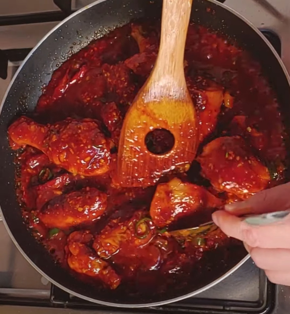 Tips: Untuk mencegah saus gosong saat melumuri ayam, tambahkan 1-2 sendok makan air ke dalam wajan saat mengaduk ayam dengan saus.
