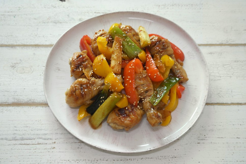 Ketika saus sudah mengental dan melapisi paha ayam dengan baik, tambahkan potongan paprika dan sisa saus kecap sebanyak sepertiga. Terus didihkan perlahan selama beberapa menit lagi sampai paprika matang namun masih sedikit renyah. Sajikan selagi hangat dengan nasi putih untuk hidangan yang lezat!
