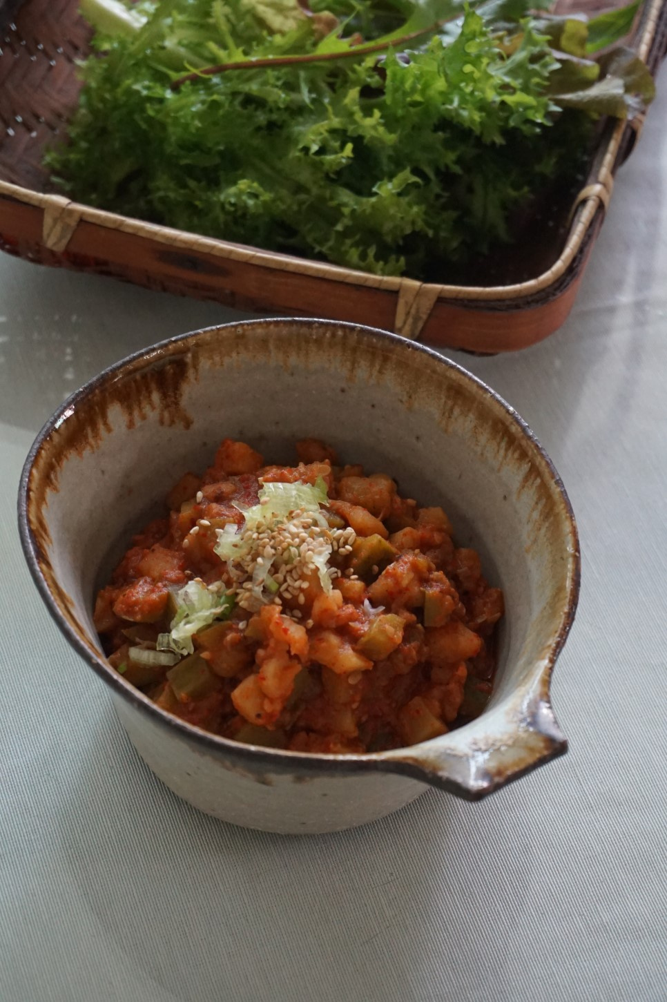 Angkat ikan teri dari kaldu. Kupas dan potong zucchini serta kentang menjadi ukuran sekali suap (sekitar 1 hingga 1,5 cm tebalnya) dan masukkan ke dalam panci. Setelah kaldu mendidih kembali, larutkan 3 sdm doenjang (pasta kedelai) dan 1 sdm gochugaru (bubuk cabai Korea) ke dalamnya, lalu aduk rata. Setelah sayuran sedikit melunak, tambahkan 1 sdt bawang putih cincang. Lanjutkan memasak dengan api sedang-rendah hingga cairan berkurang dan mengental seperti glasir.