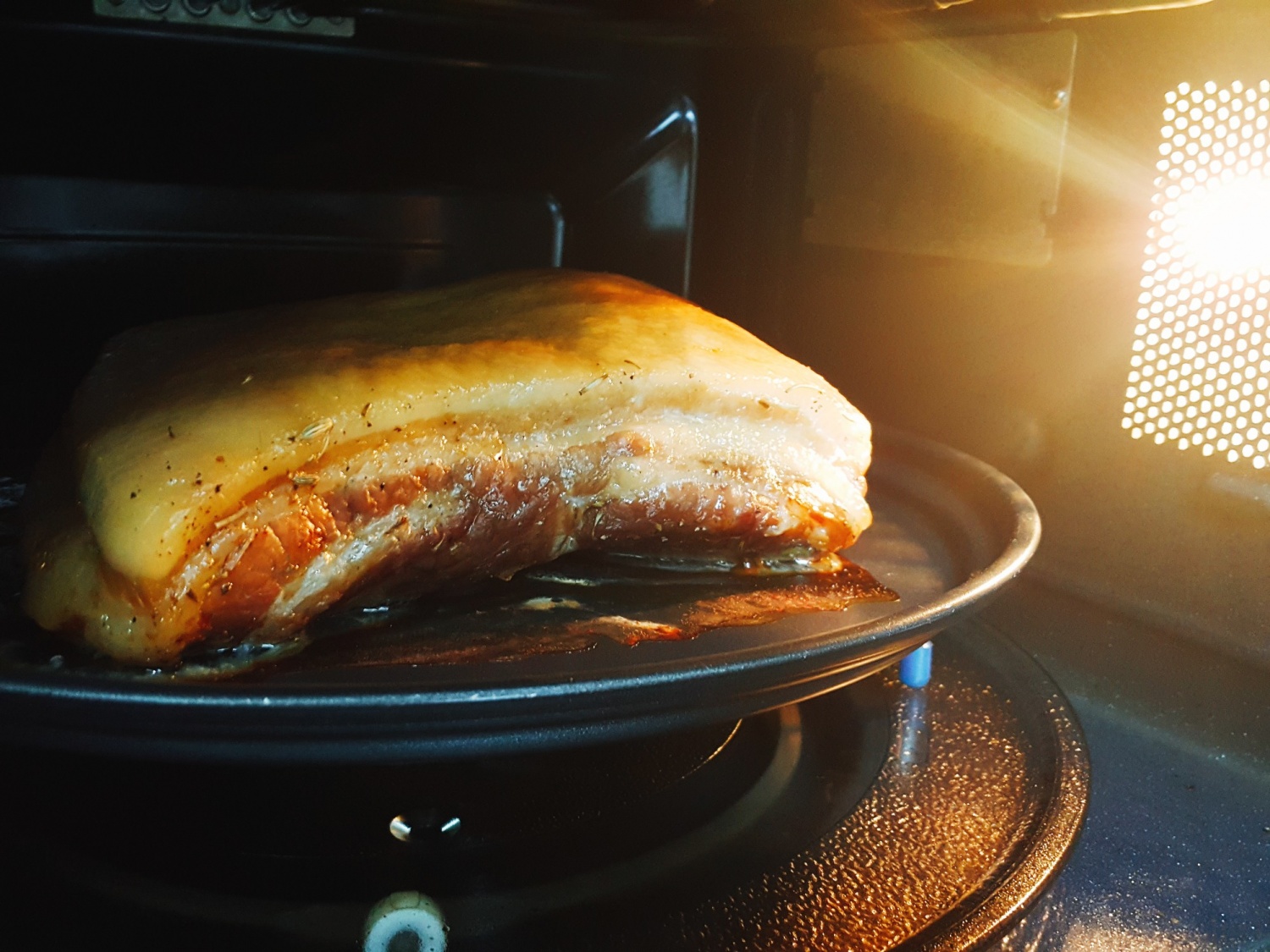 Panaskan oven Anda hingga 100°C (212°F). Letakkan perut babi kering di atas rak oven atau loyang dan panggang selama kurang lebih 4 jam. Metode memasak suhu rendah dan durasi panjang ini memastikan bacon menjadi empuk dan matang merata.