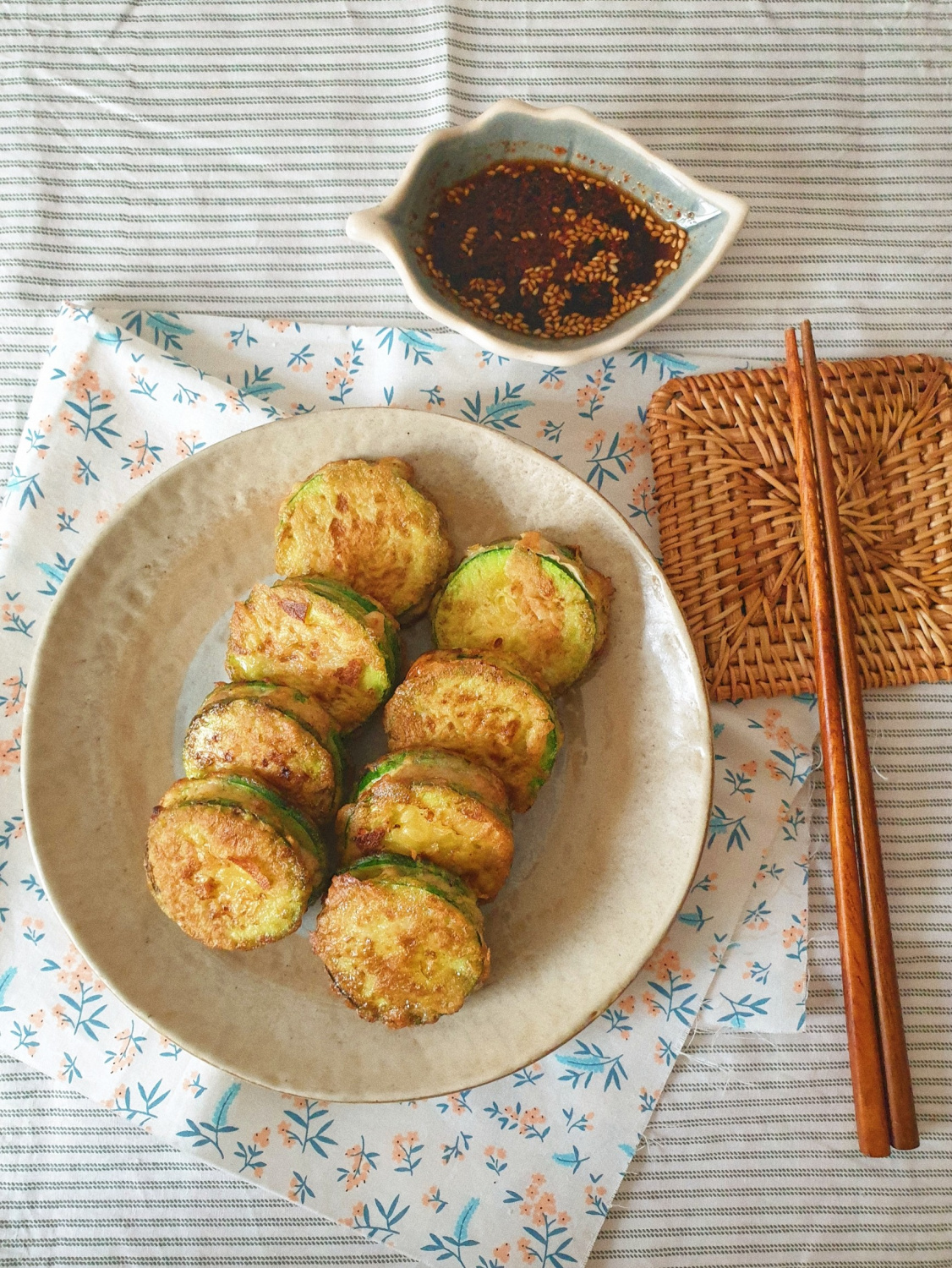 Baluri sandwich zucchini yang sudah dibuat dengan tepung gorengan (buchim garu) secara merata. Pastikan daging tertutup rapat agar tidak berjatuhan saat dimasak. Oleskan lapisan tipis dan merata untuk menghindari tekstur yang terlalu tebal.