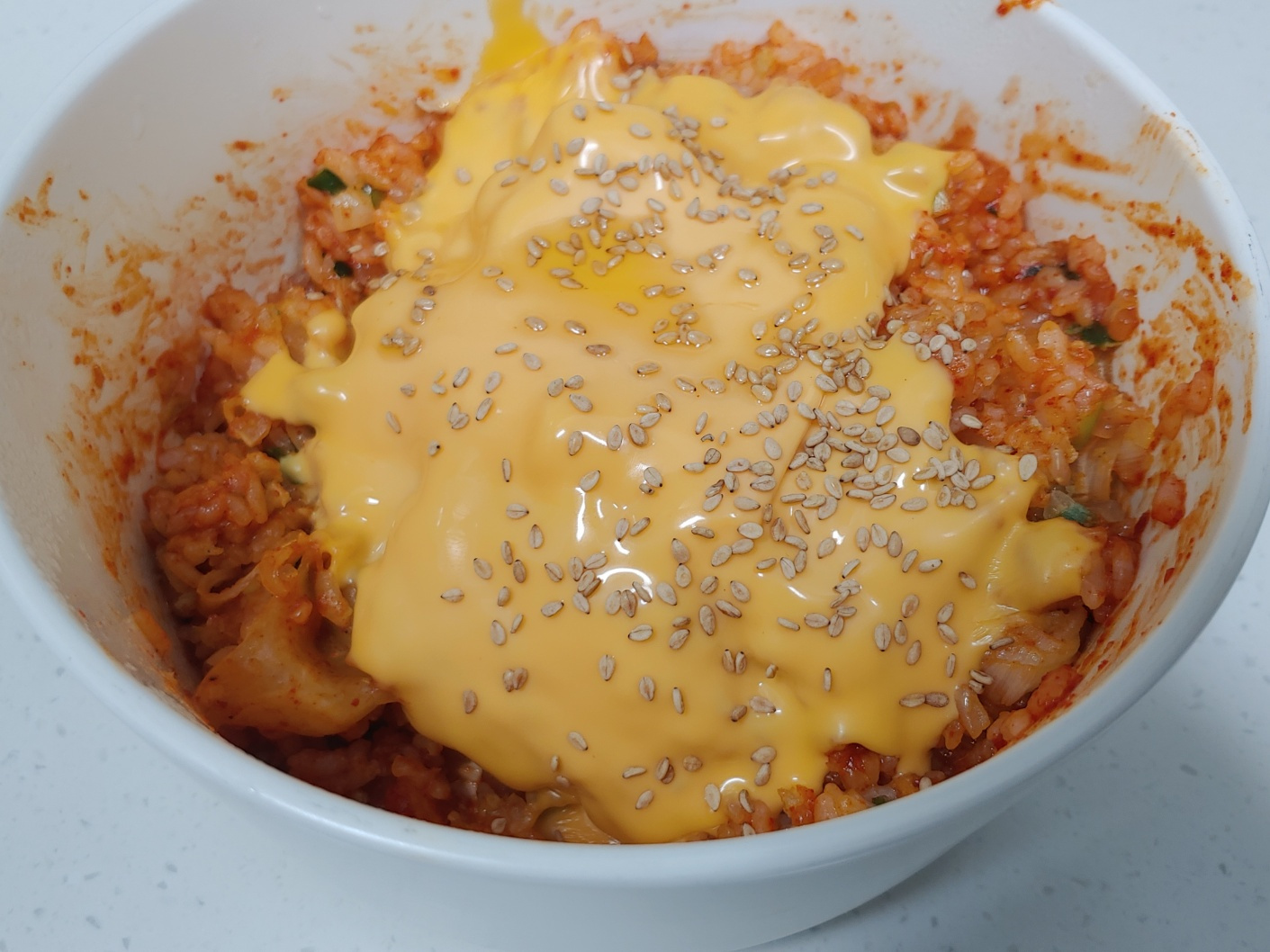 Selagi keju meleleh, taburkan 1 sendok makan biji wijen di atas bibimbap untuk aroma kacang yang gurih dan tekstur renyah yang memuaskan. Tekstur dan aroma biji wijen akan semakin meningkatkan kelezatan hidangan ini.