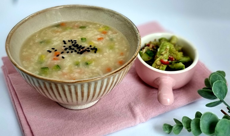 Bubur Akar Teratai dan Labu sangat cocok dipadukan dengan salad mentimun acar manis-asam (Oi Tang Tang Yi)! Kesegaran salad mentimun menambah keceriaan pada bubur yang lembut dan ringan, menciptakan kombinasi fantastis yang membangkitkan selera.