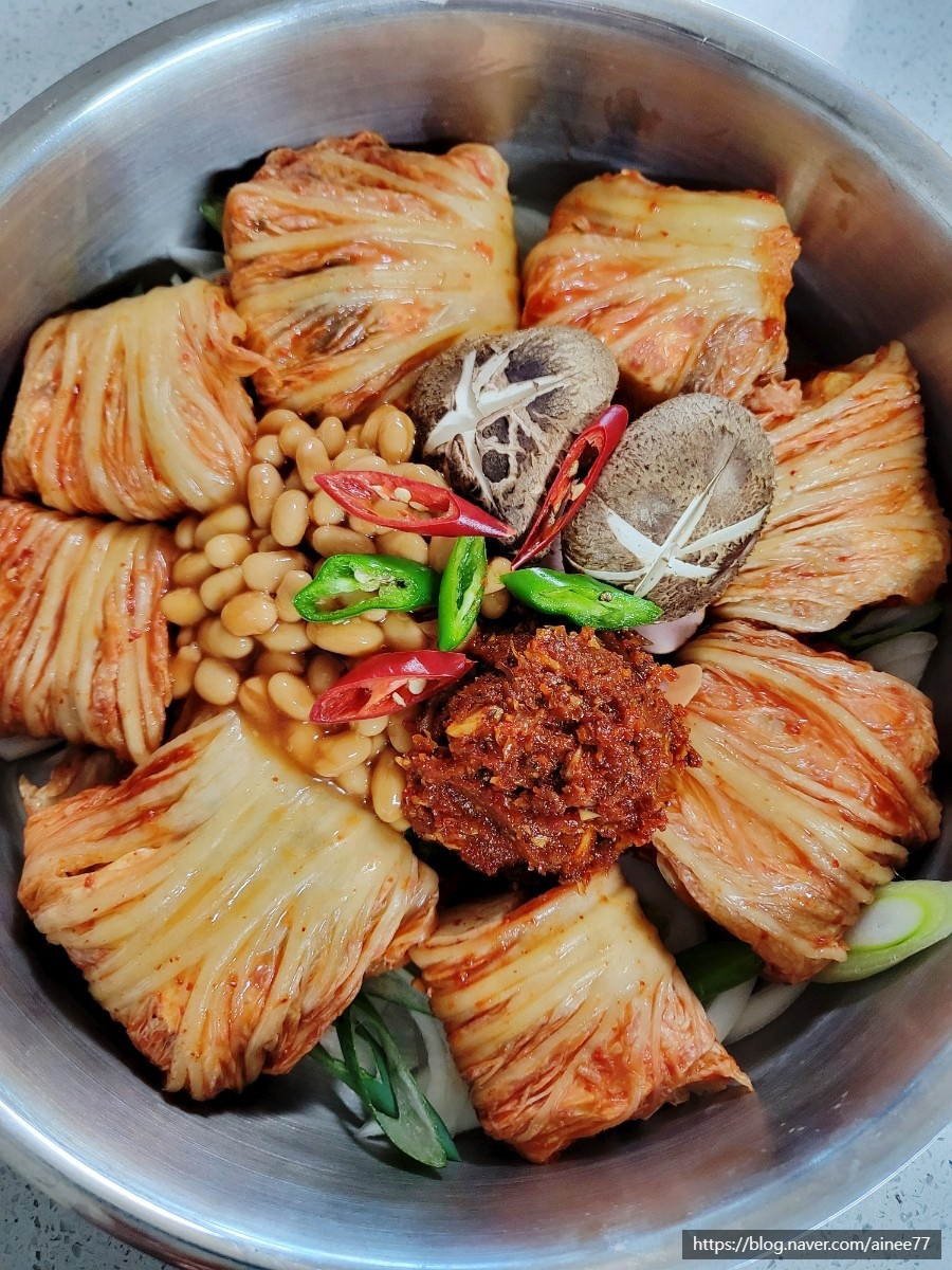 Tuangkan 300ml air rendaman beras dengan hati-hati ke dalam panci, tuang di sisi-sisinya agar tidak mengganggu susunan. Cairan harus sedikit menutupi bahan-bahannya. Setelah mulai mendidih, cicipi kuahnya. Jika kurang rasa, tambahkan 3 sdm air rendaman kimchi untuk tambahan rasa pedas dan gurih, lalu didihkan dengan api besar hingga mendidih.