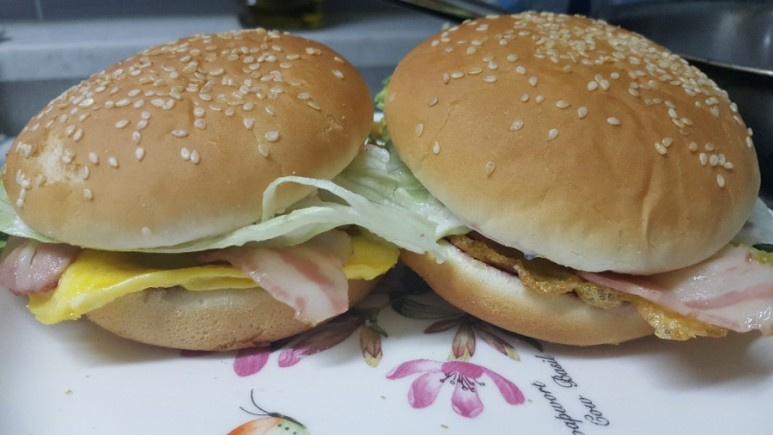 Di atas dadar telur, susun dua lembar bacon renyah yang sudah dimasak. Rasa gurih dan kaya dari bacon akan meningkatkan kelezatan burger.