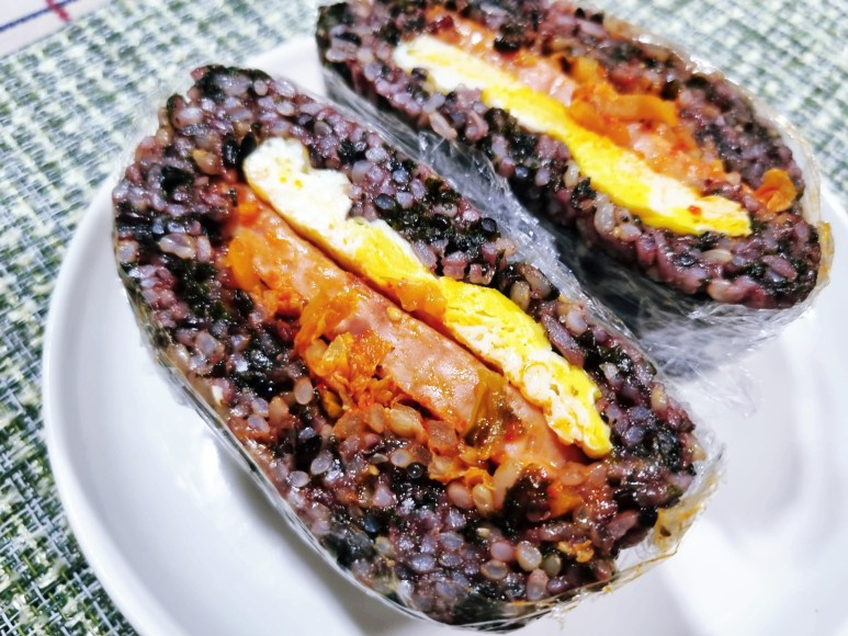 Di atas nasi, tambahkan kimchi tumis secukupnya, diikuti dengan Spam goreng yang sudah matang. Terakhir, letakkan telur mata sapi yang sudah disiapkan. Menambahkan isian dalam jumlah banyak akan menghasilkan burger nasi yang lebih padat dan beraroma.
